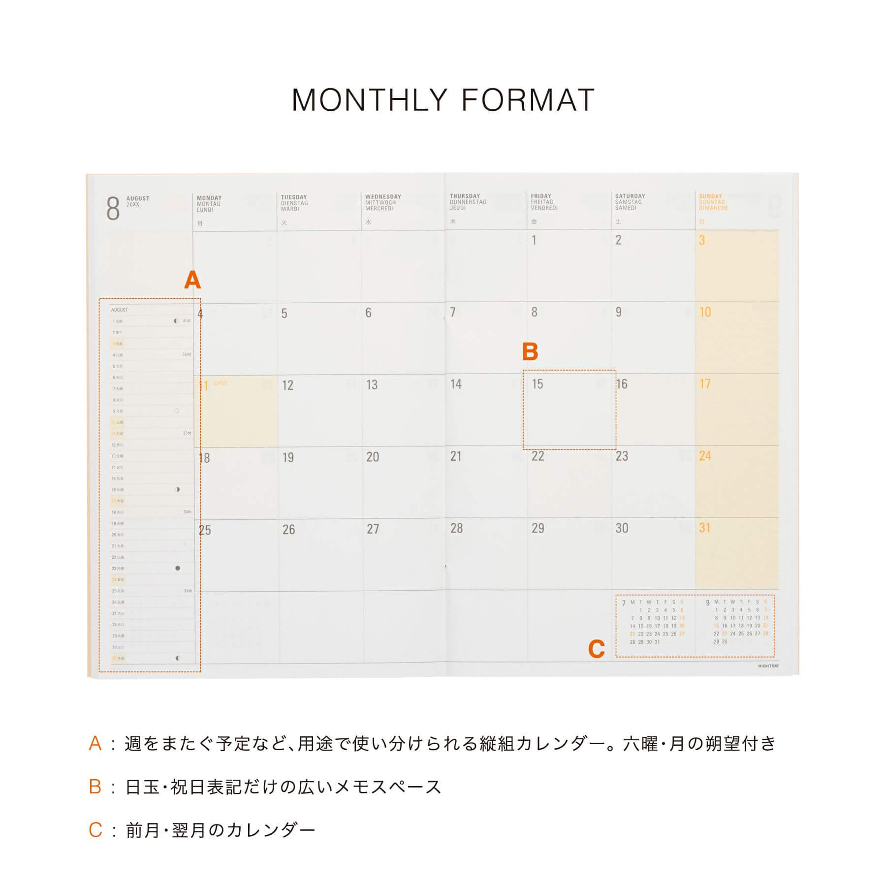 Designed for both clarity and flexibility, the monthly layout features a vertical calendar format with Japanese lunar phases and six-day cycle notations.