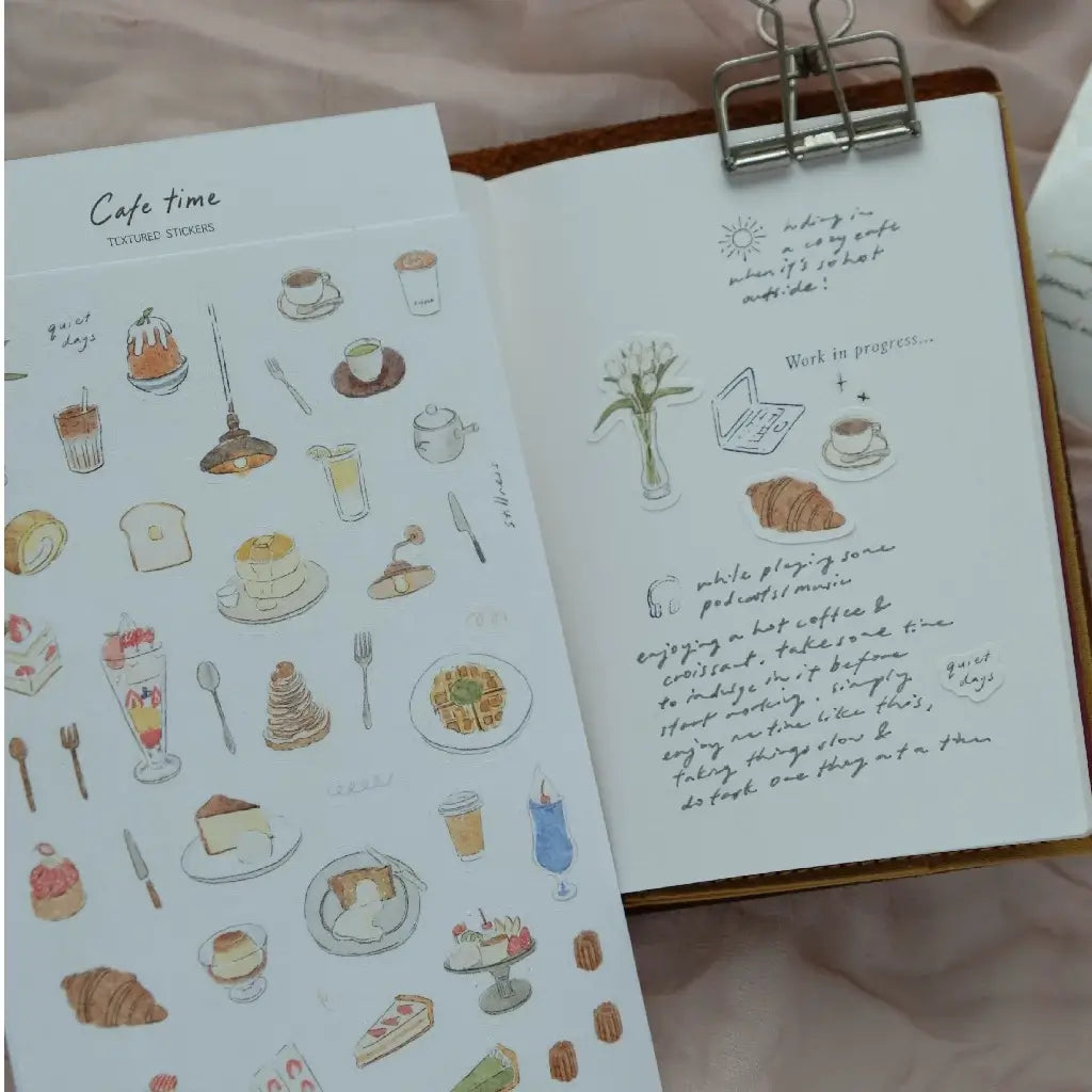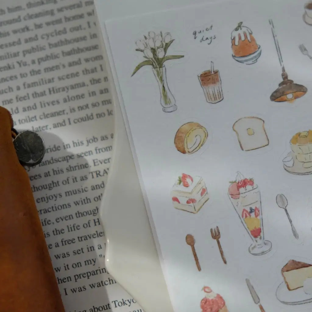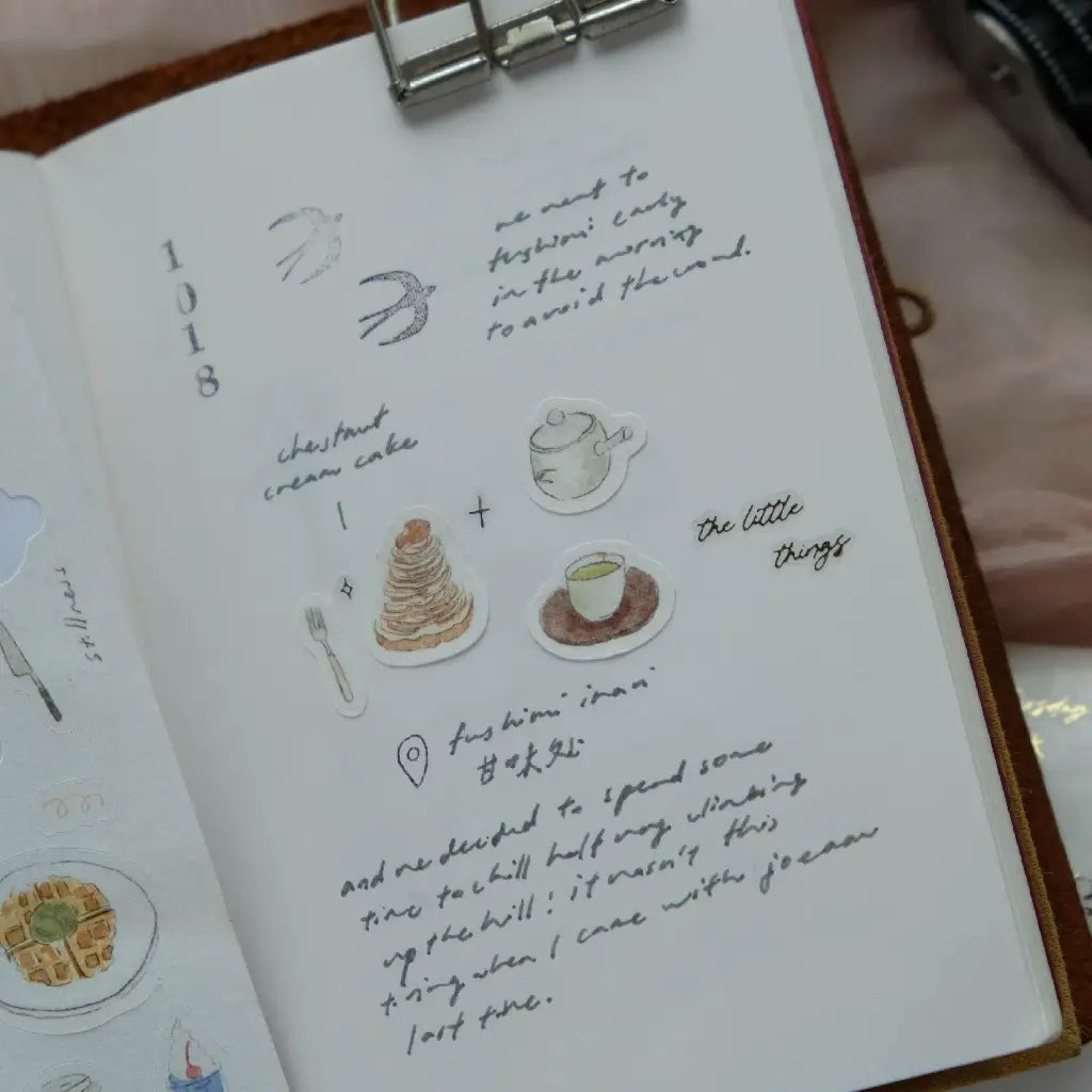 This sticker captures the warmth and charm of moments spent in a cozy café. Featuring beautifully illustrated elements you’d find at your favourite coffee spot. From cups of coffee and pastries to tableware, books, and little café essentials, this sticker brings a touch of calm, comfort, and café nostalgia to your journaling.
