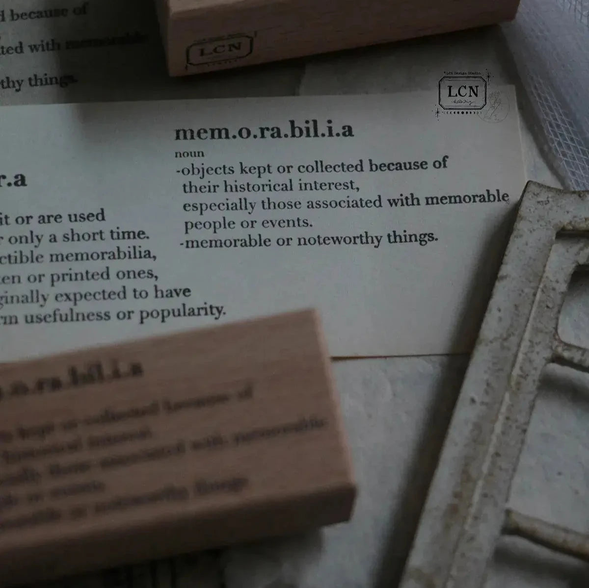 This rubber stamp features design: "memorabilia," offering a vintage, dictionary-inspired aesthetic. Perfect for adding a touch of nostalgia to your journal pages, letters, scrapbooks, or any creative projects. It captures the essence of historical significance and fleeting moments, helping you create thoughtful and meaningful designs.