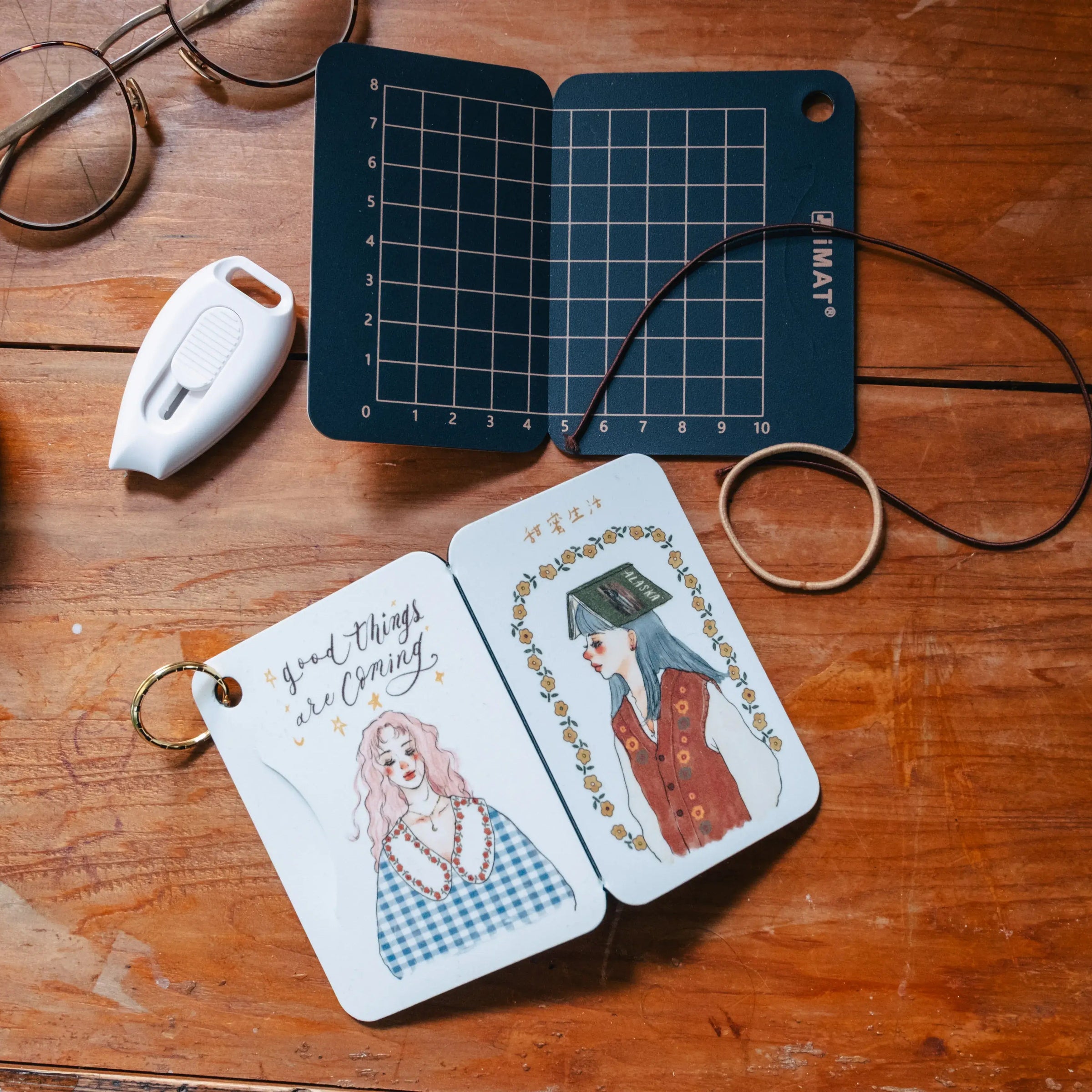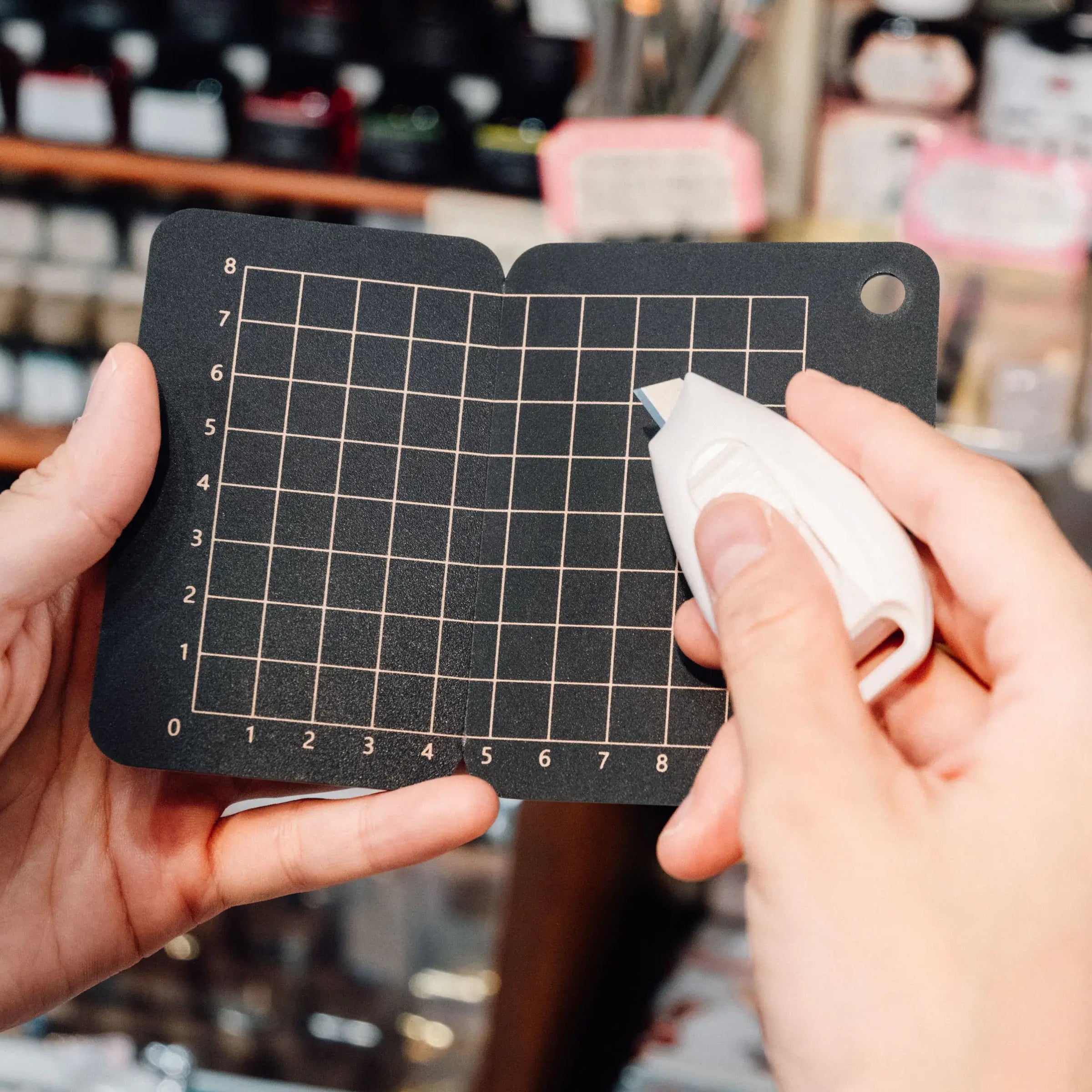 The cutting mat features a dual-colour surface with a measuring grid on the back, making quick and precise cuts easy. Its foldable clasp design keeps the mat securely closed, while the hanging hole and strap allow it to be attached to a bag, pouch, or planner.