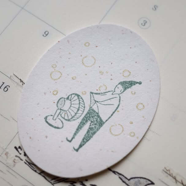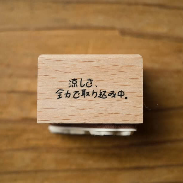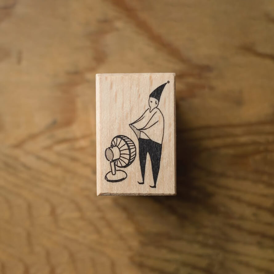 This rubber stamp features a little elf standing in front of a fan, doing their best to catch every bit of cool air. Paired with the phrase “Taking in cool air with all my might,” the design captures a familiar summer moment with gentle humour.