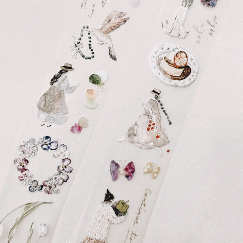 Featuring charming hand-painted scenes of everyday life, this tape showcases delightful floral elements, quaint objects, and carefree figures enjoying the simple moments. The pastel tones and soft illustrations evoke a sense of serenity and whimsy, making this tape perfect for journaling, decorating planners, or creating special notes.