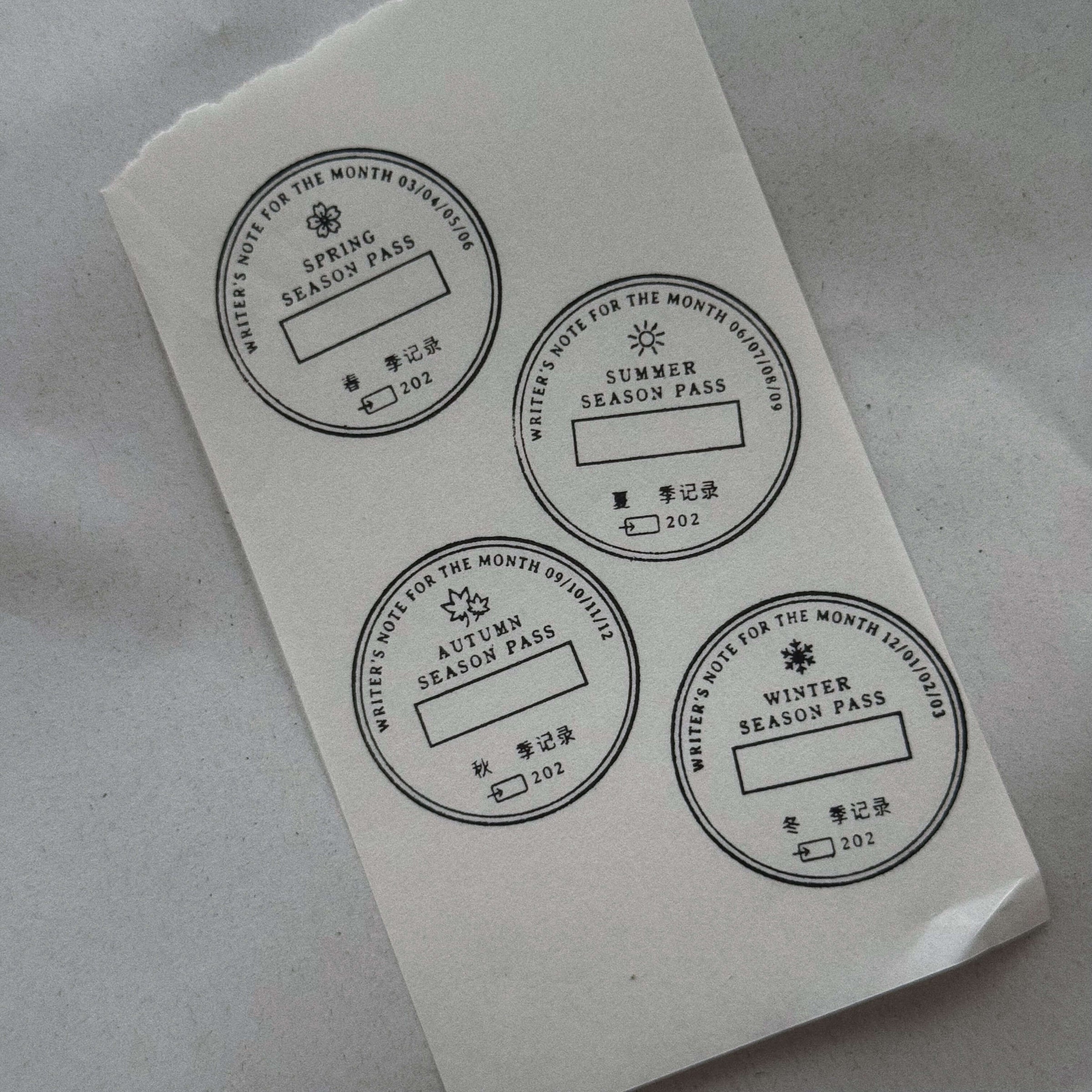 This collection features four seasonal designs: Spring, Summer, Autumn, and Winter — each framed in a classic circular postmark style with an open space for personal notes, places, or dates.