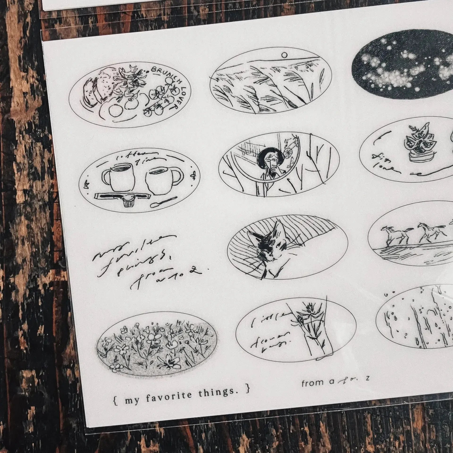 Turn quiet sketches into gentle moments on your pages with this lovely sticker sheet, a sticker inspired by the draft illustrations from My Favorite Things PET Tape.