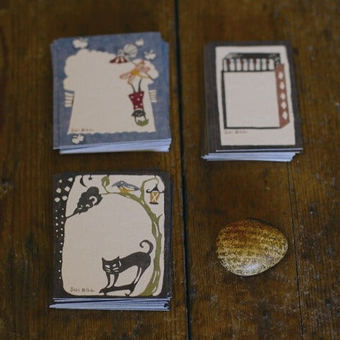 These message cards are printed with beautiful illustrations designed by Mihoko Seki. The artist's unique vision has been beautifully encapsulated in these petite message cards. These cards are perfect for adding a thoughtful touch to small gifts or for daily messages and notes. Crafted from sturdy cardstock, they provide an excellent writing surface on the back. Discover the world of Mihoko Seki through these lovely message cards, where rustic charm meets heartfelt simplicity.