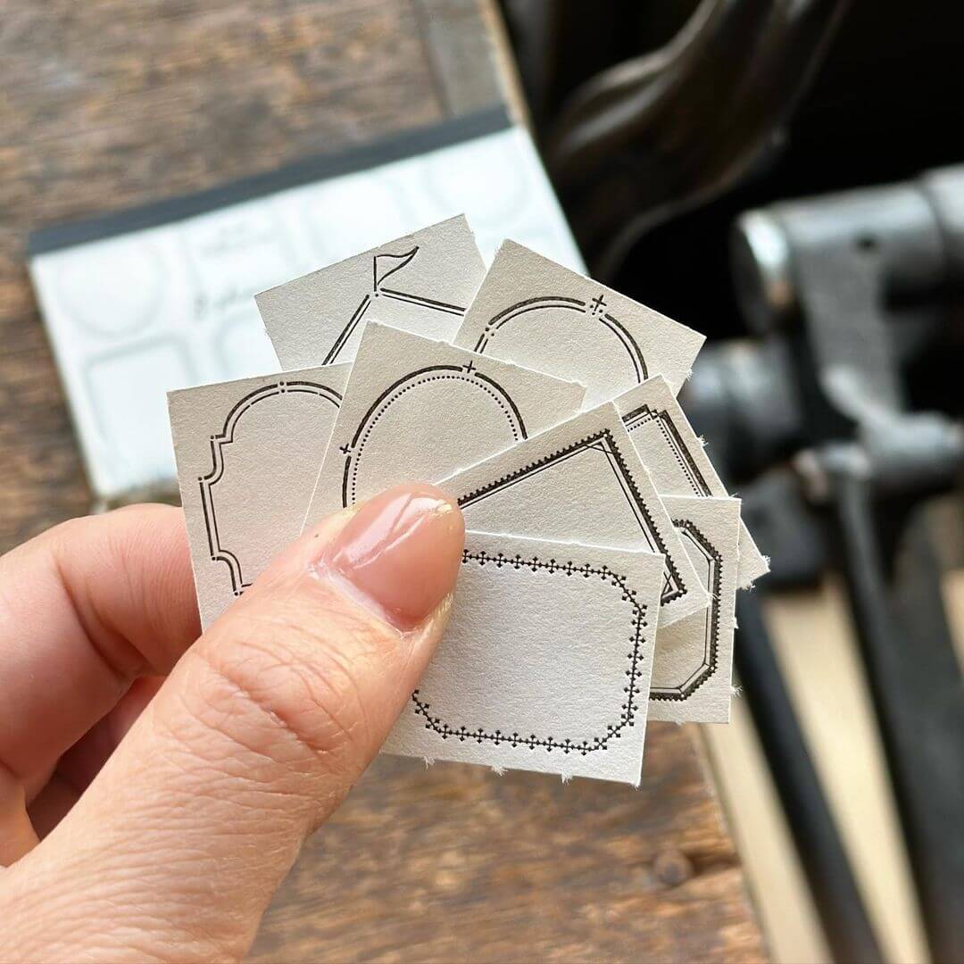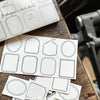 Letterpress label book featuring an array of eight unique shapes. When detached, each shape measures 24×28mm, offering small yet versatile parts. Use these labels for stamping, writing, or in various scenarios to add charm to your moments.