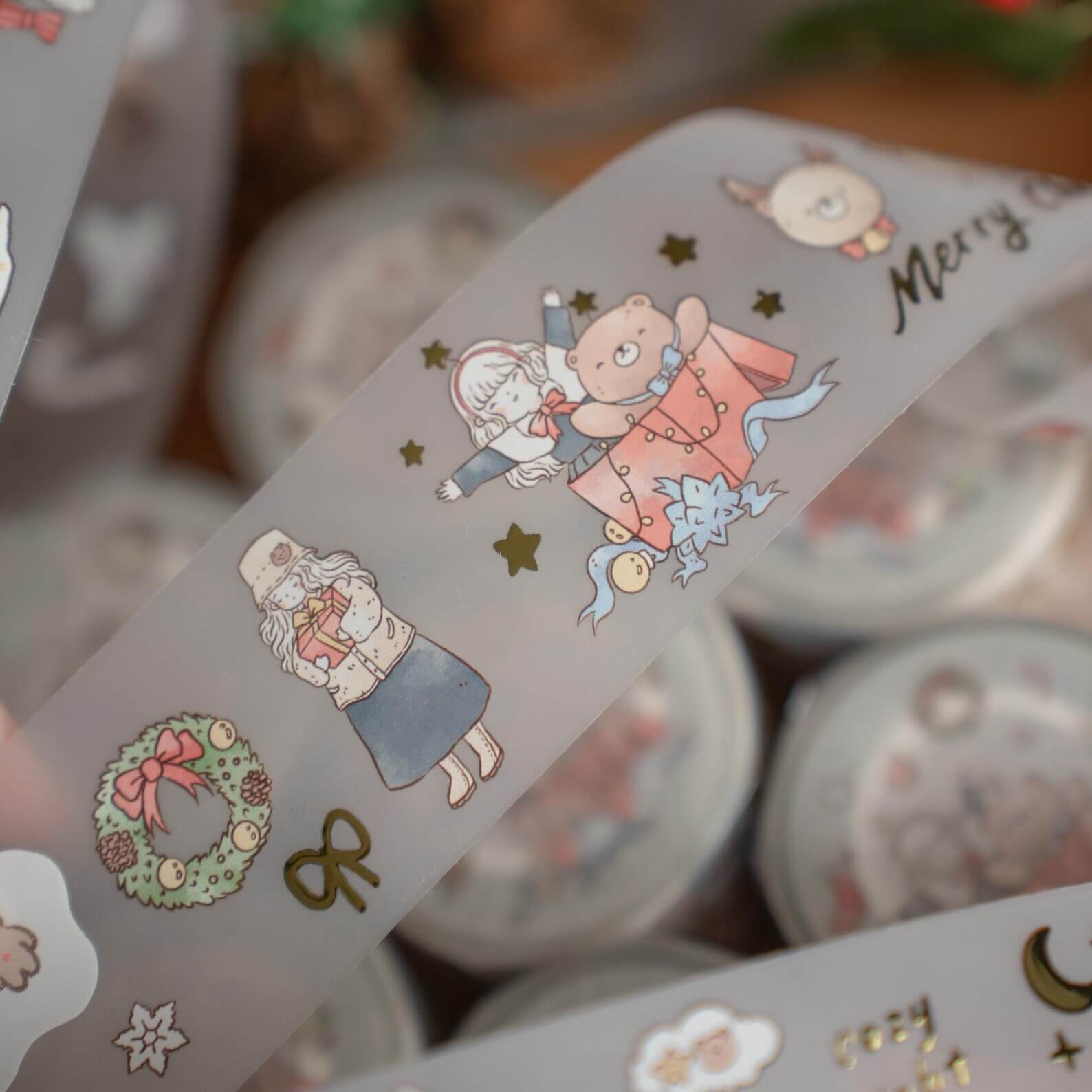 Lovely gold foil stamping PET tape features original illustrations by shō Little Happiness. This tape carries the gentle magic of the season. Cozy bears, delicate snowfall, evergreen sprigs, and festive touches, all rendered in her signature style of quiet charm.