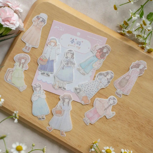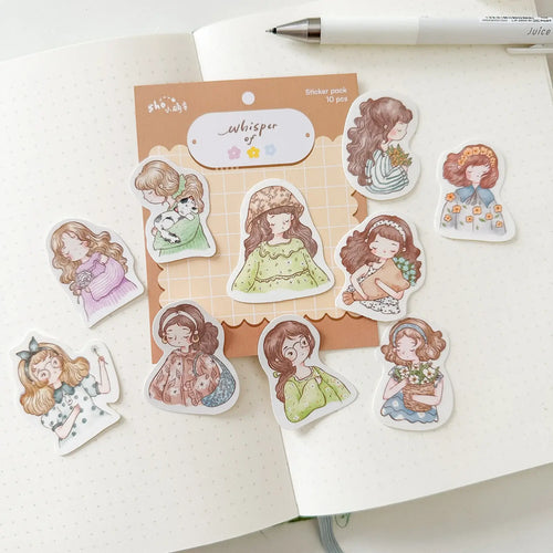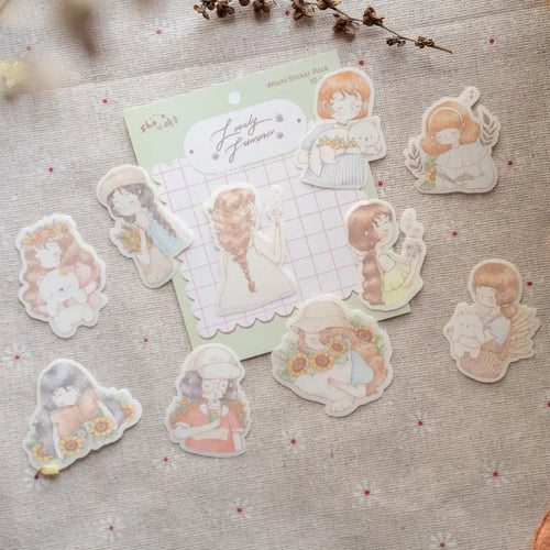 Her signature “shō girls” appear in gentle, storybook-like scenes: sipping coffee, strolling with flowers, reading quietly, or enjoying the company of cozy cats, owls, and woodland friends. Illustrated in delicate watercolour tones, each creation radiates warmth and the quiet sparkle of cherished routines.