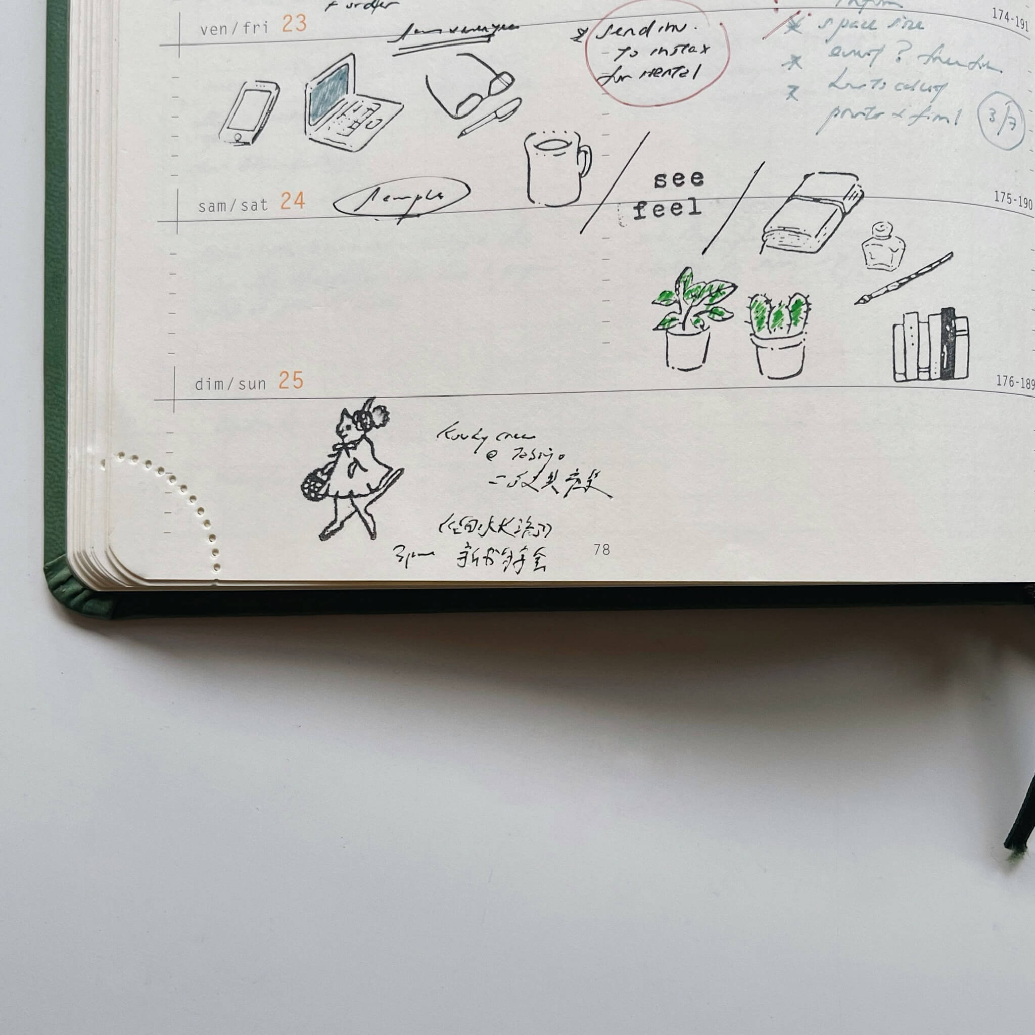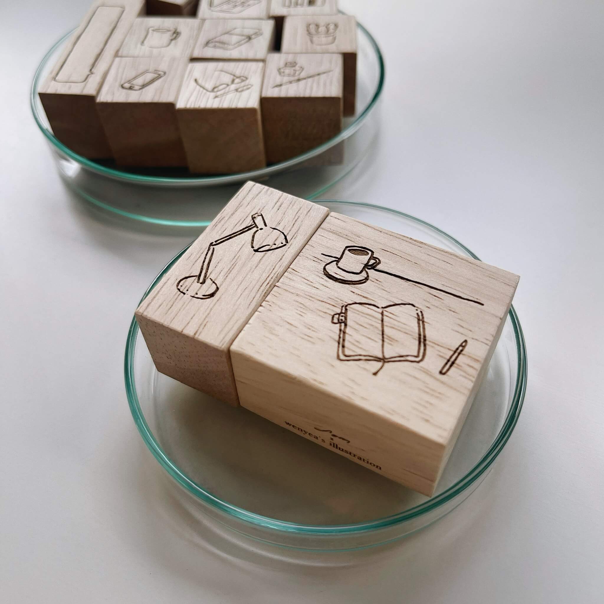(smartphone / journal book / laptop / dip pen & ink bottle / books / my favourite mug / glasses / cactus / that small plant) 2x2cm