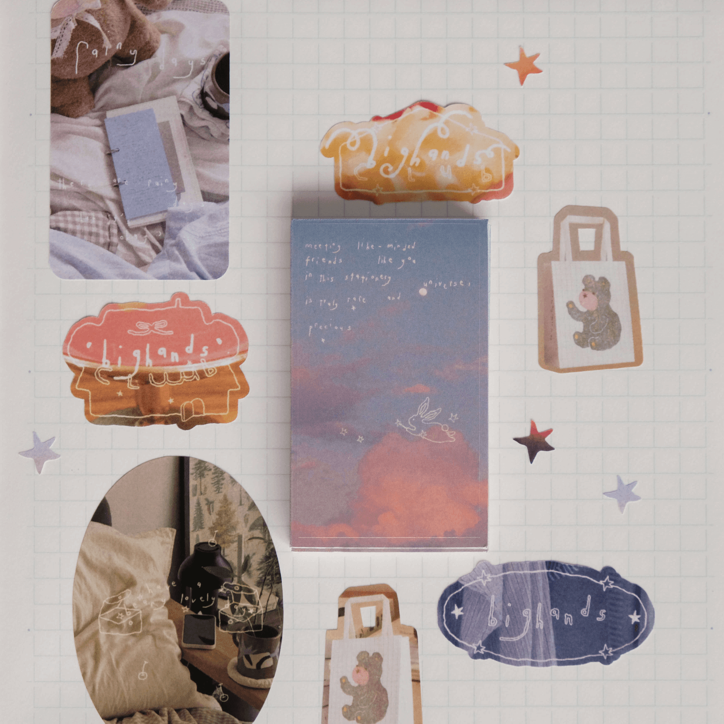 This sticker pack byย bighandsย is made to sprinkle warmth into everyday moments. Soft photographs, gentle illustrations, and tiny star-like details come together like fragments of wandering thoughts. Each sticker feels like a pause. A ribbon tying a memory. An umbrella appearing just when you need it.