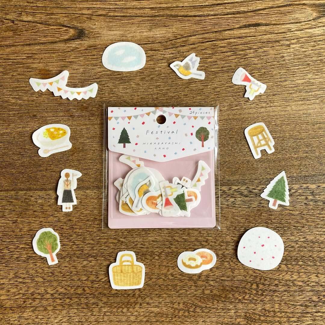 Capture the joyful atmosphere of markets and festivals with this charming flake-sticker set by Kano Hirabayashi. Inspired by bustling stalls, flea markets, and festive gatherings, each design reflects the little moments that make these outings feel special and memorable.