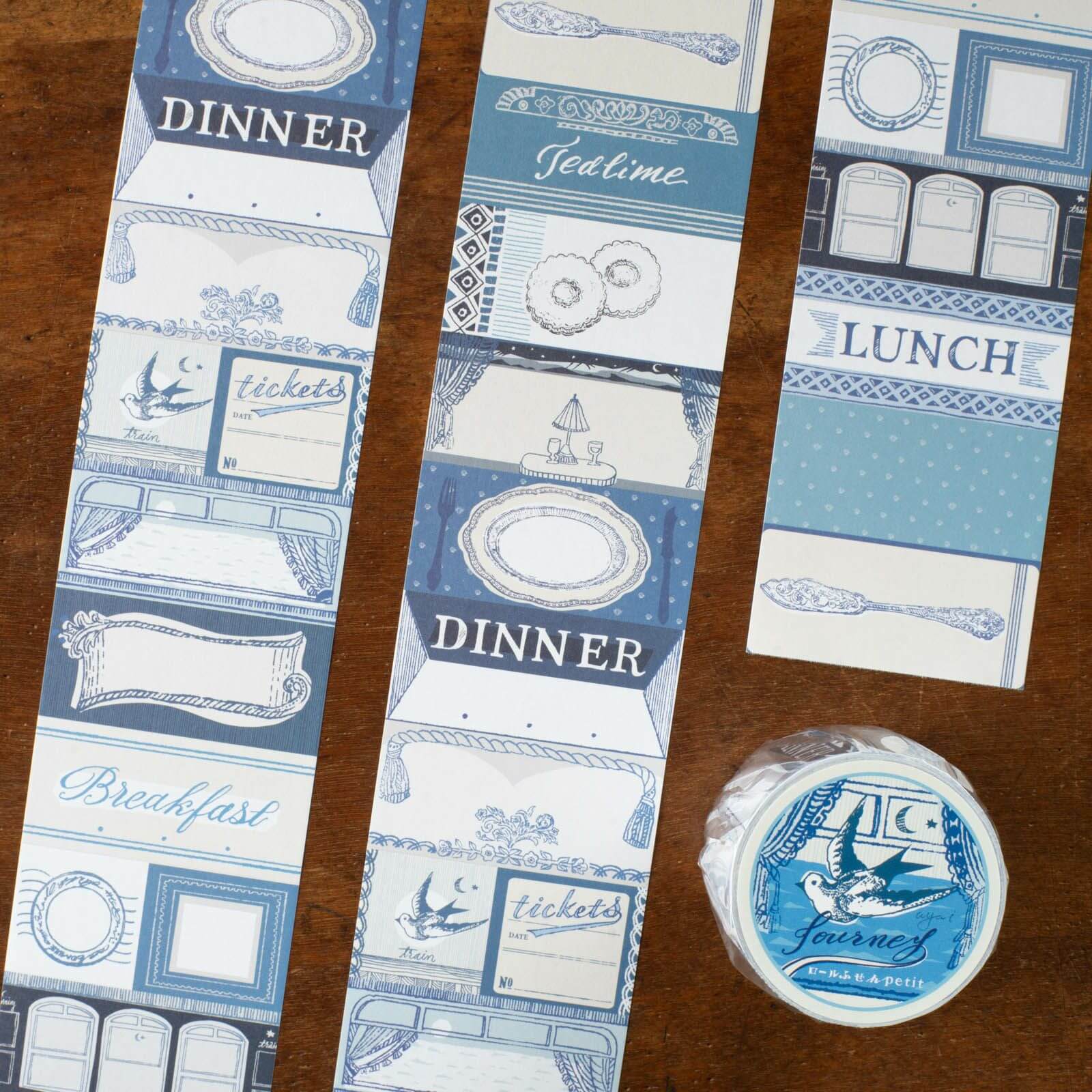 Each design of this charming sticky memo roll is inspired by the romance of a dining train, imaginary travels that begin at the port and continue inland, where meal tickets, window views, and quiet moments of lunch and tea time unfold in delicate linework.