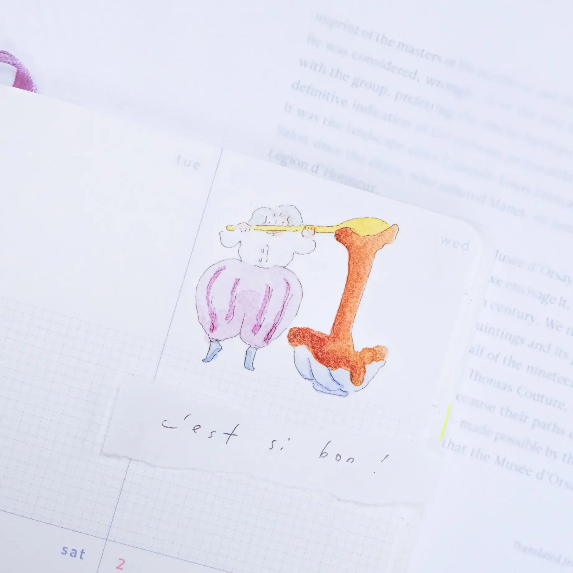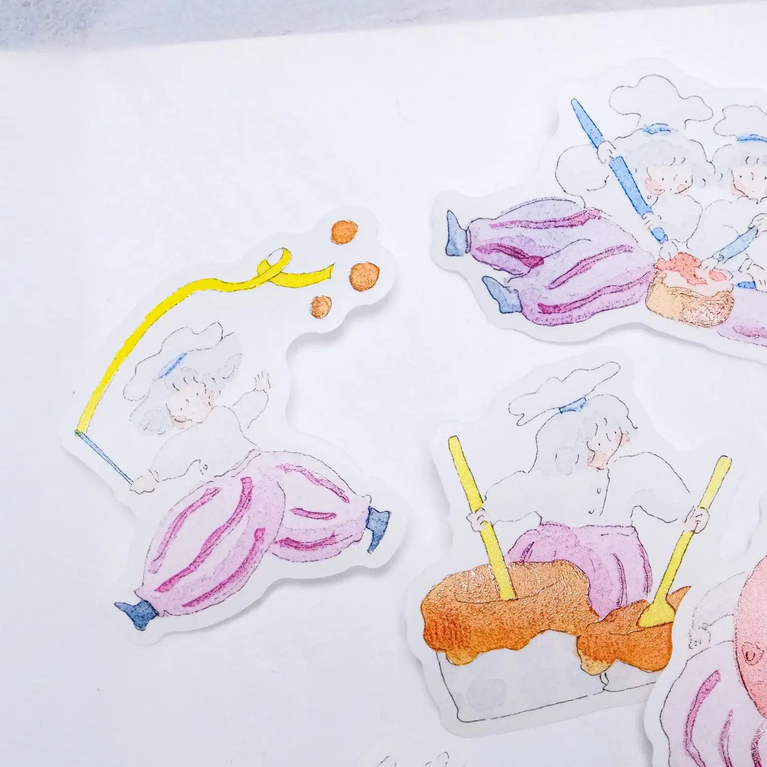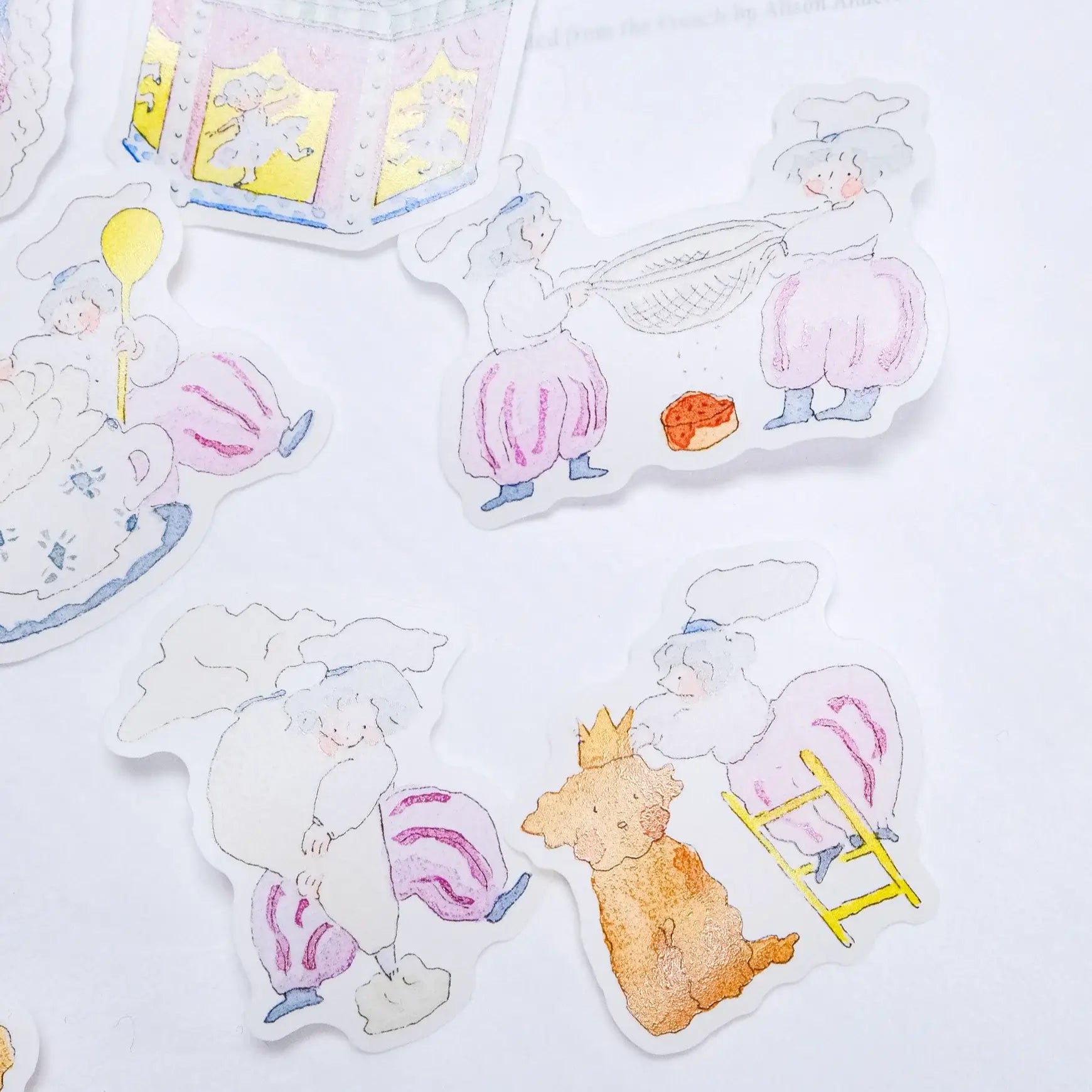 Open the box and step into a dreamlike patisserie, where gentle characters whisk, dip, and pour sweetness into every scene. Each sticker tells its own quiet story of warmth, comfort, and everyday delight.