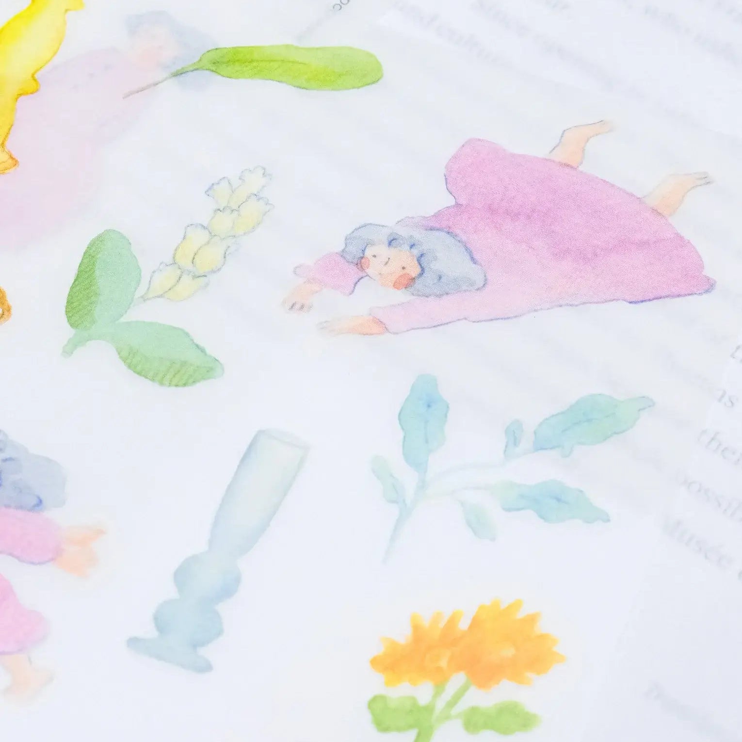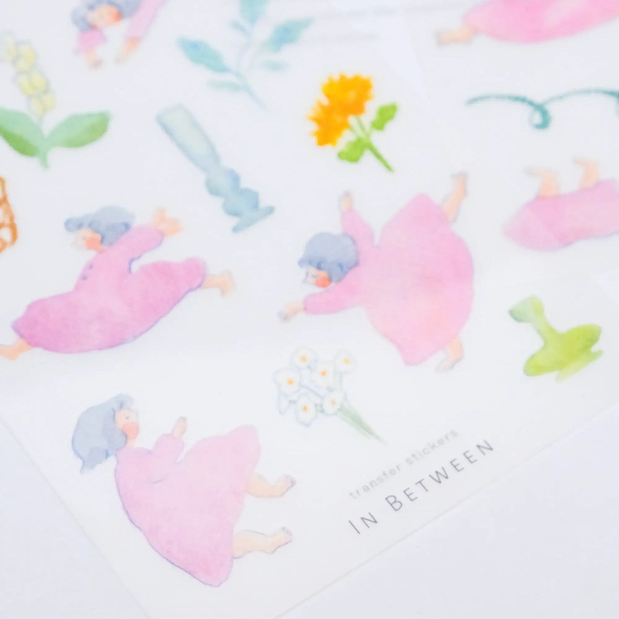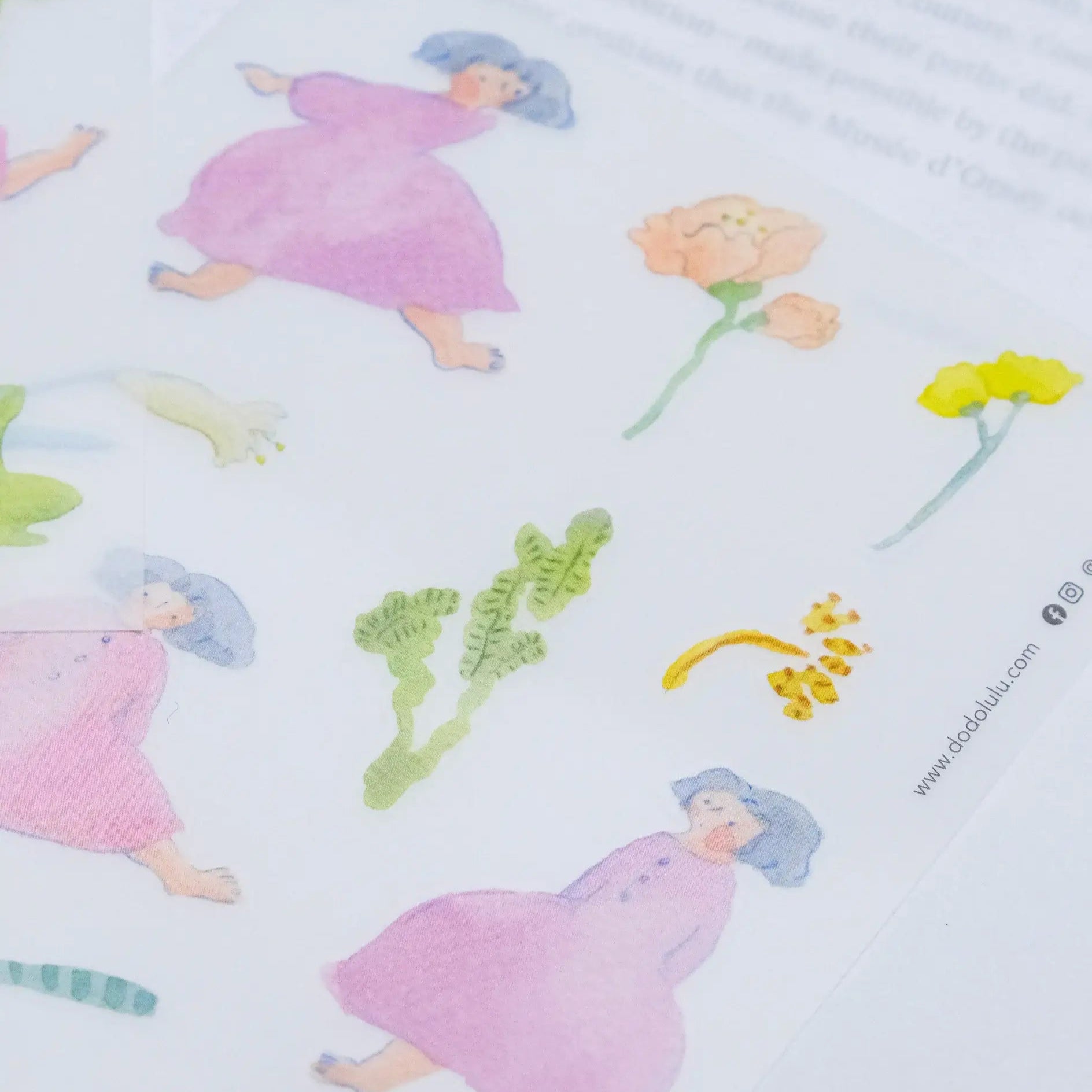 Bring a gentle charm to your pages with dodolulu’s rub-on transfer stickers, where art and softness drift together like a quiet dream. Each sheet features her signature watercolour illustrations, serene figures wandering among flowers and vases, capturing the stillness and beauty found in in-between moments.