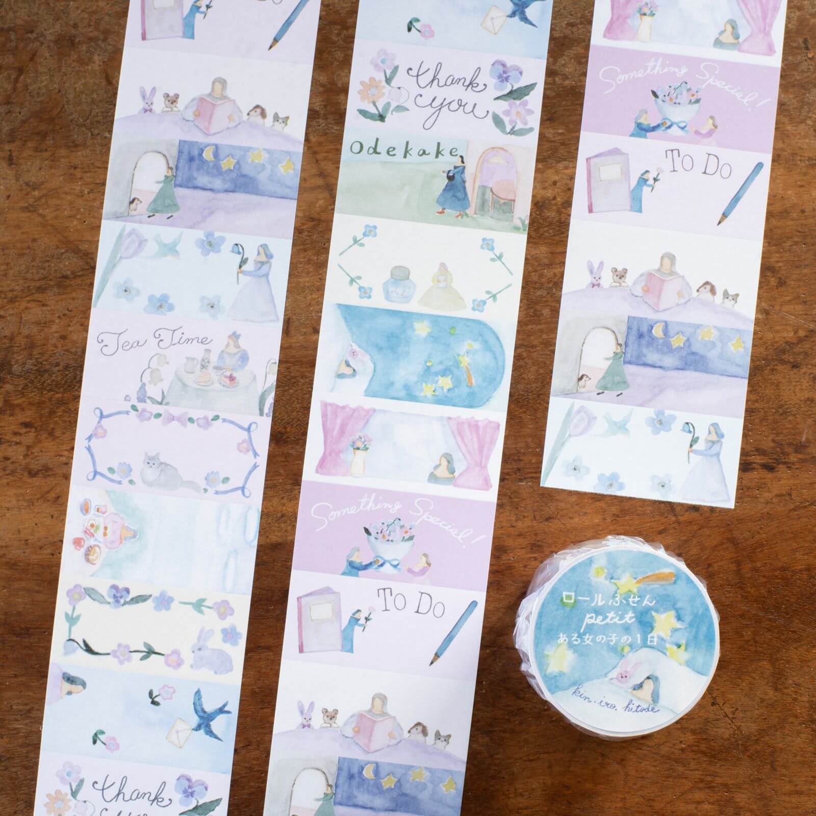 kin.iro.hitode’s romantic, storybook-like world now appears in this petite roll sticky note set. Inspired by “A Girl’s Day,” each label captures a different moment, from breakfast and heading out, to tea time, returning home, and drifting off to sleep. Soft pastel tones, gentle details, and the sweet animal companions bring a tender, whimsical feeling to every piece.