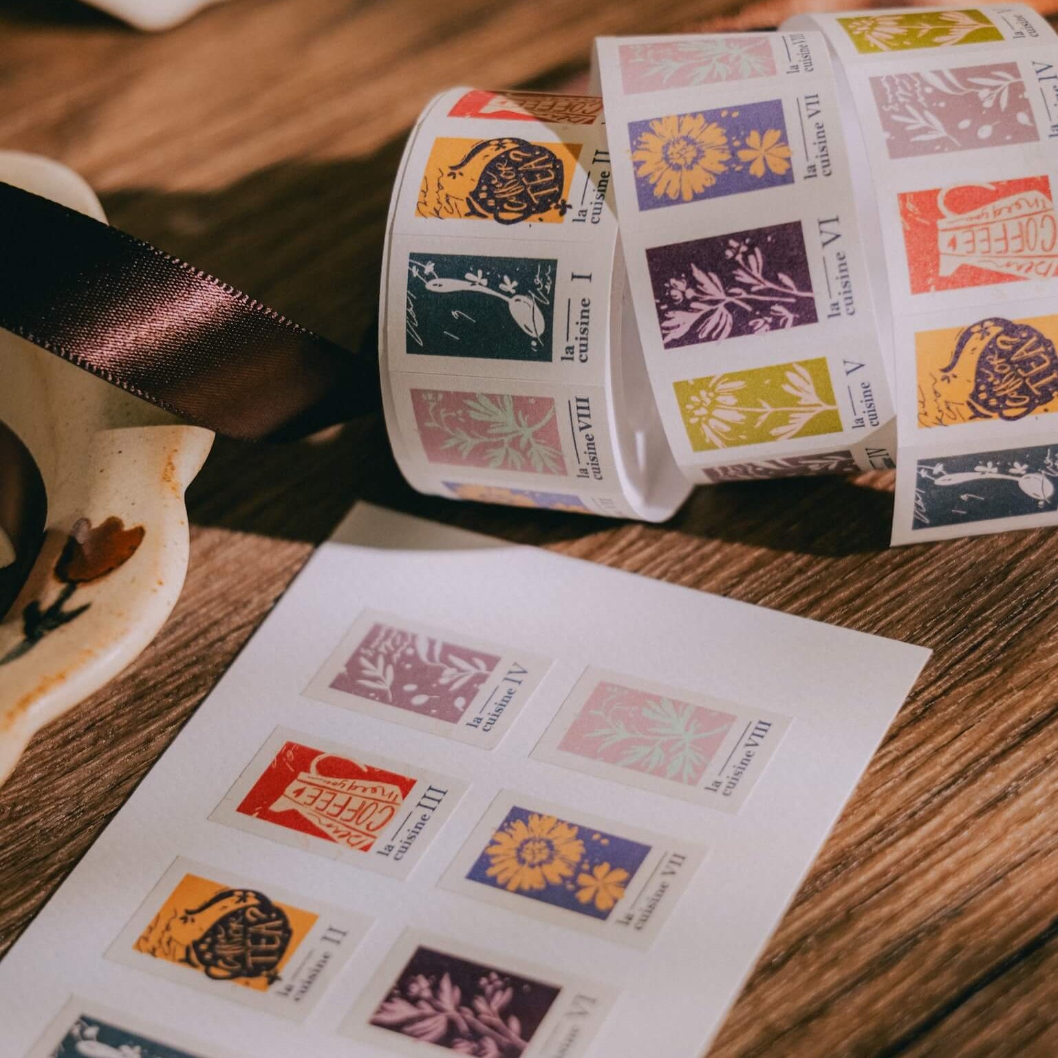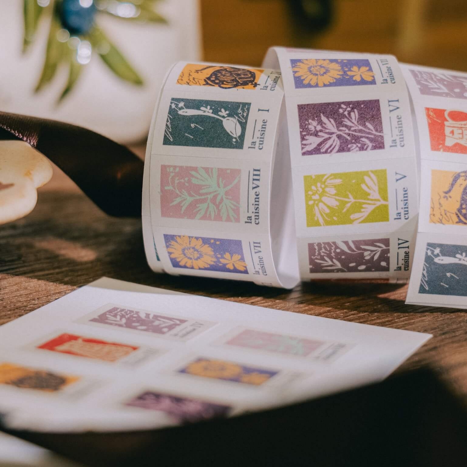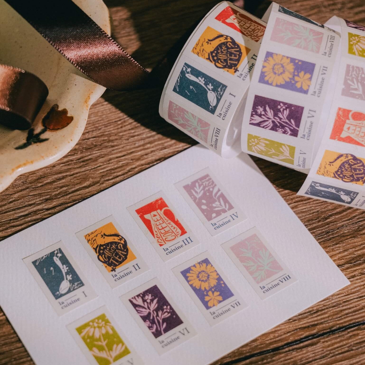 From a warm cup of coffee to the quiet bloom of flowers, this sticker roll features a series of miniature art prints that celebrate the charm of everyday life Each label feels like a small gallery piece, with rich colours and hand-carved textures that recall vintage linocut prints.