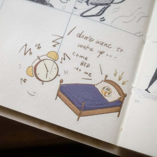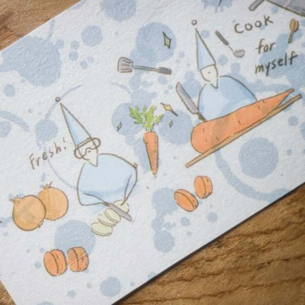 The “Morning” scenes are filled with toast, coffee, and the gentle chaos of starting a day, while the “Night” designs slow things down with winding routines, time with a cat, simple cooking, and moments of rest after a long day. Each character and detail is drawn with tender humour, turning ordinary actions into warm, relatable stories.
