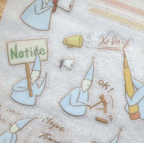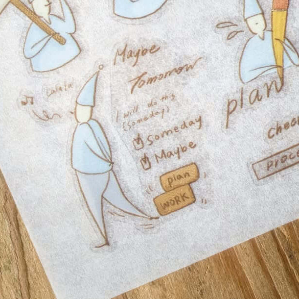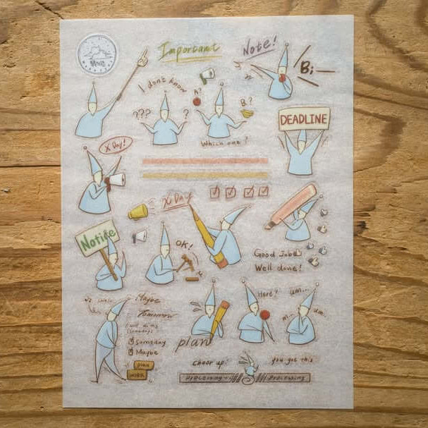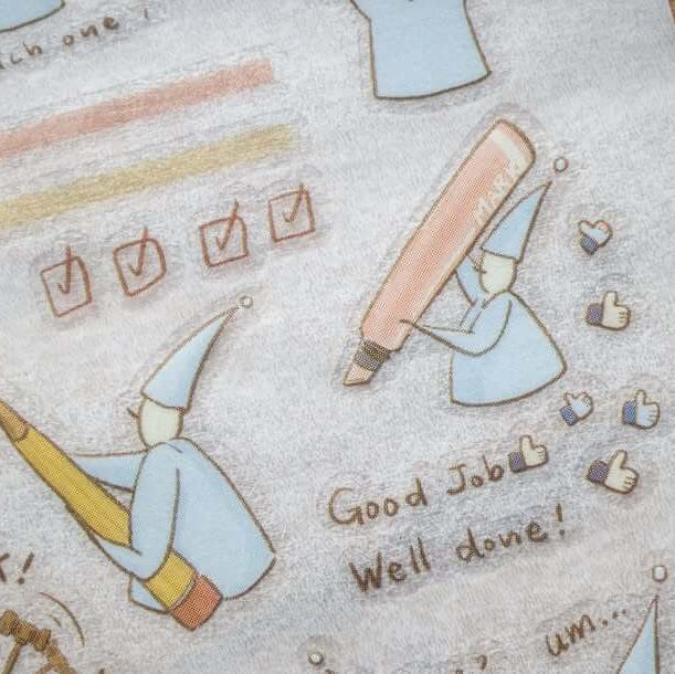 This adorable transfer sticker features the ever busy and slightly mischievous little elves as they work through their days, sometimes productive, sometimes procrastinating, and always relatable. Perfect for marking deadlines, important notes, or those “maybe later” moments in your planner.