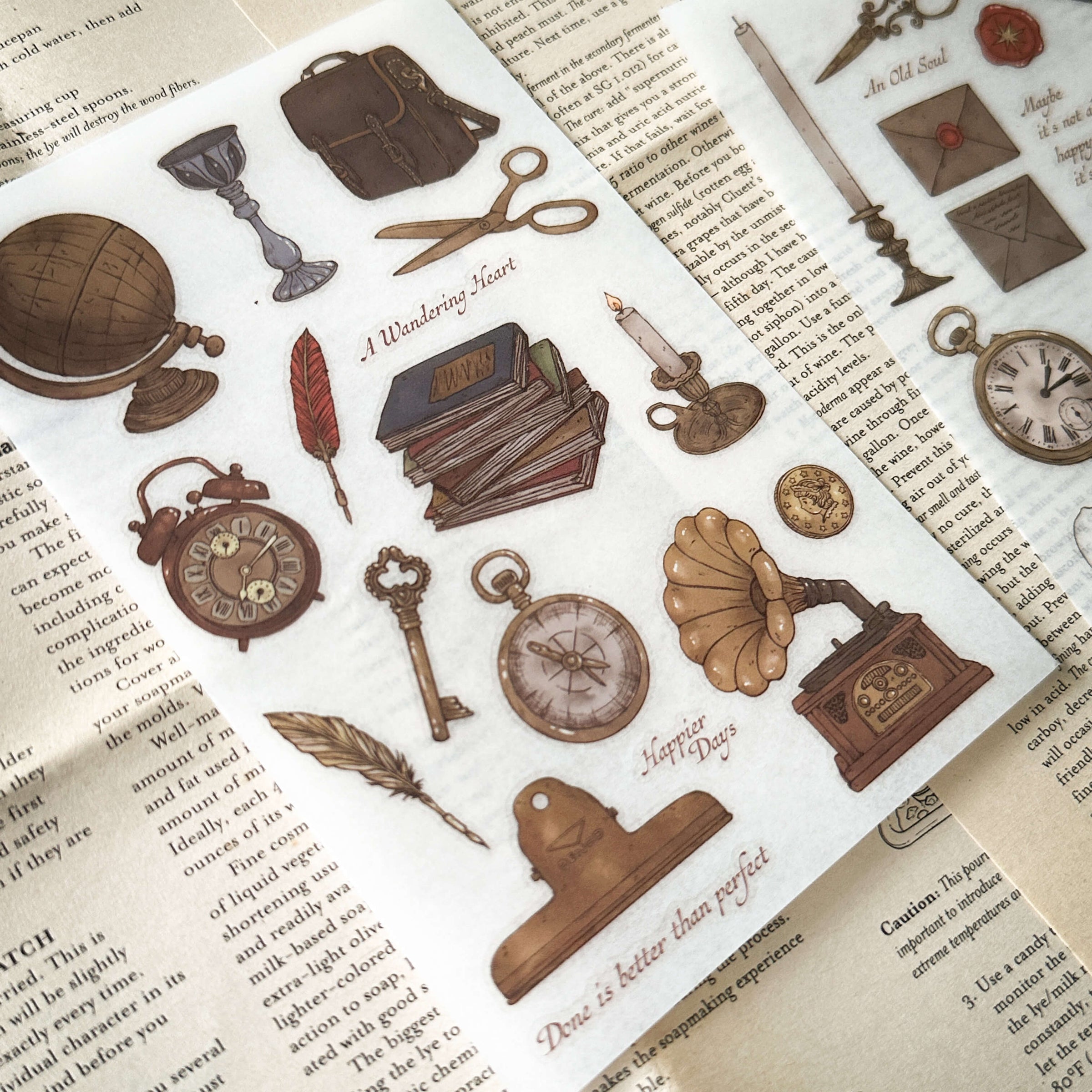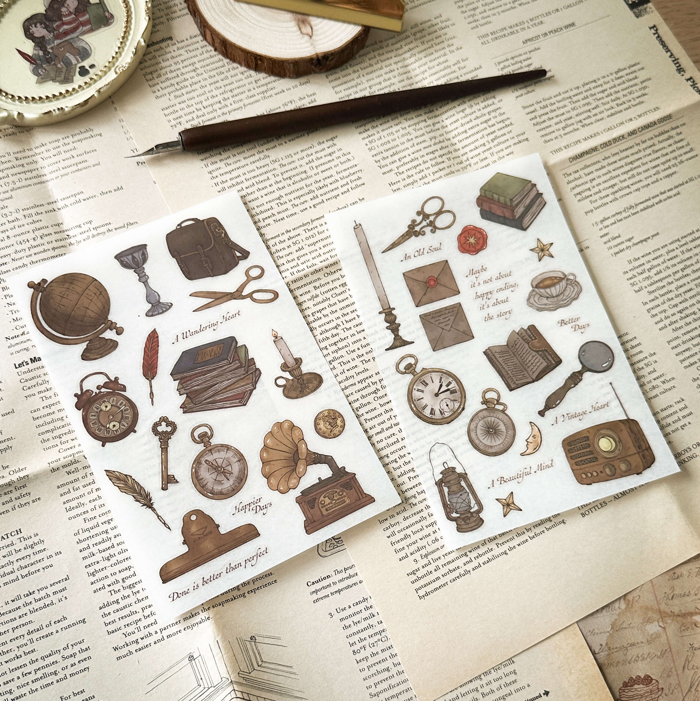 Inspired by old letters, antique tools, pocket watches, candles, radios, and well-loved books, this vintage-style transfer sticker set feels like a collection of memories from another time. Each motif carries the warmth of handwritten stories, slow days, and nostalgic details, perfect for building gentle, story-filled journal pages and collage spreads.