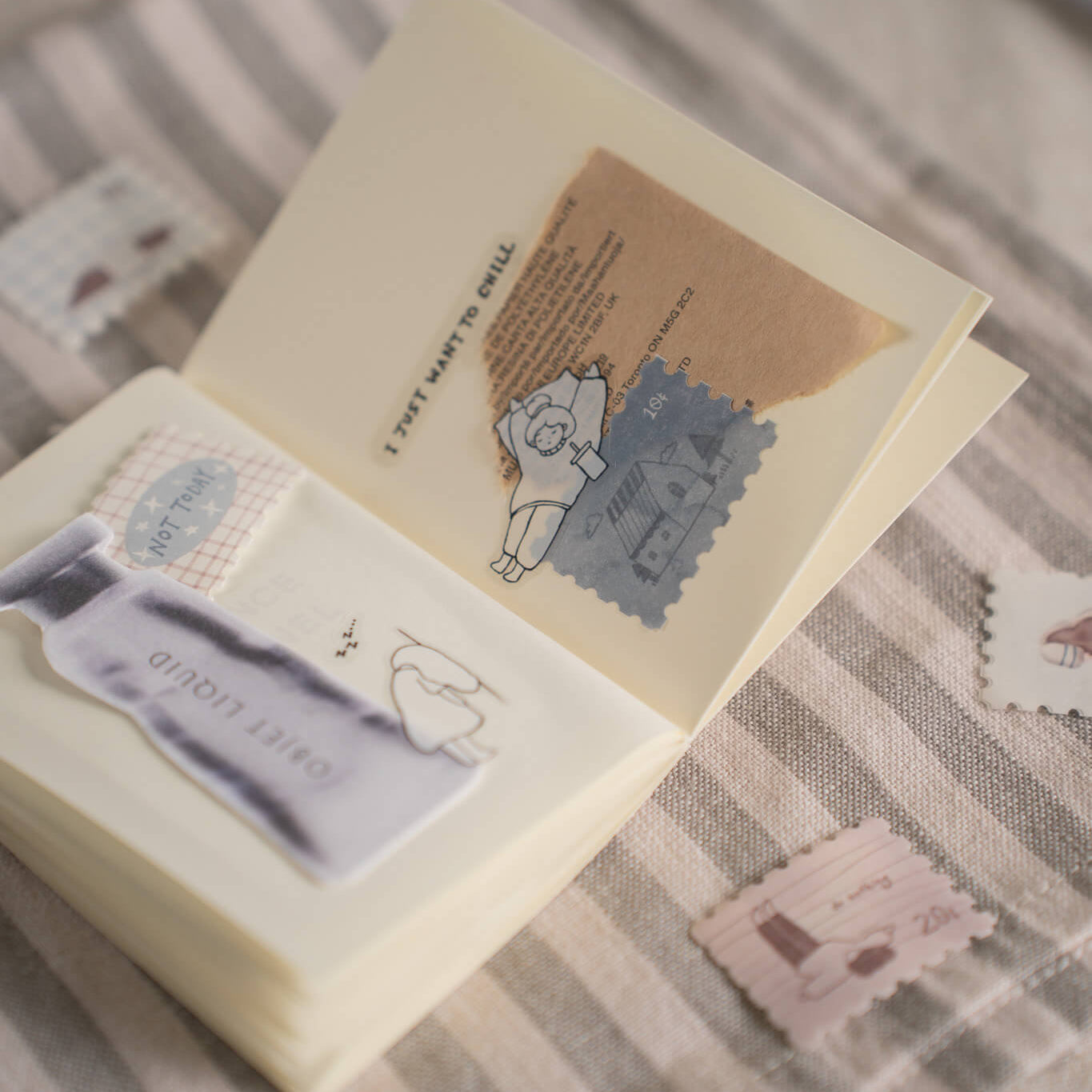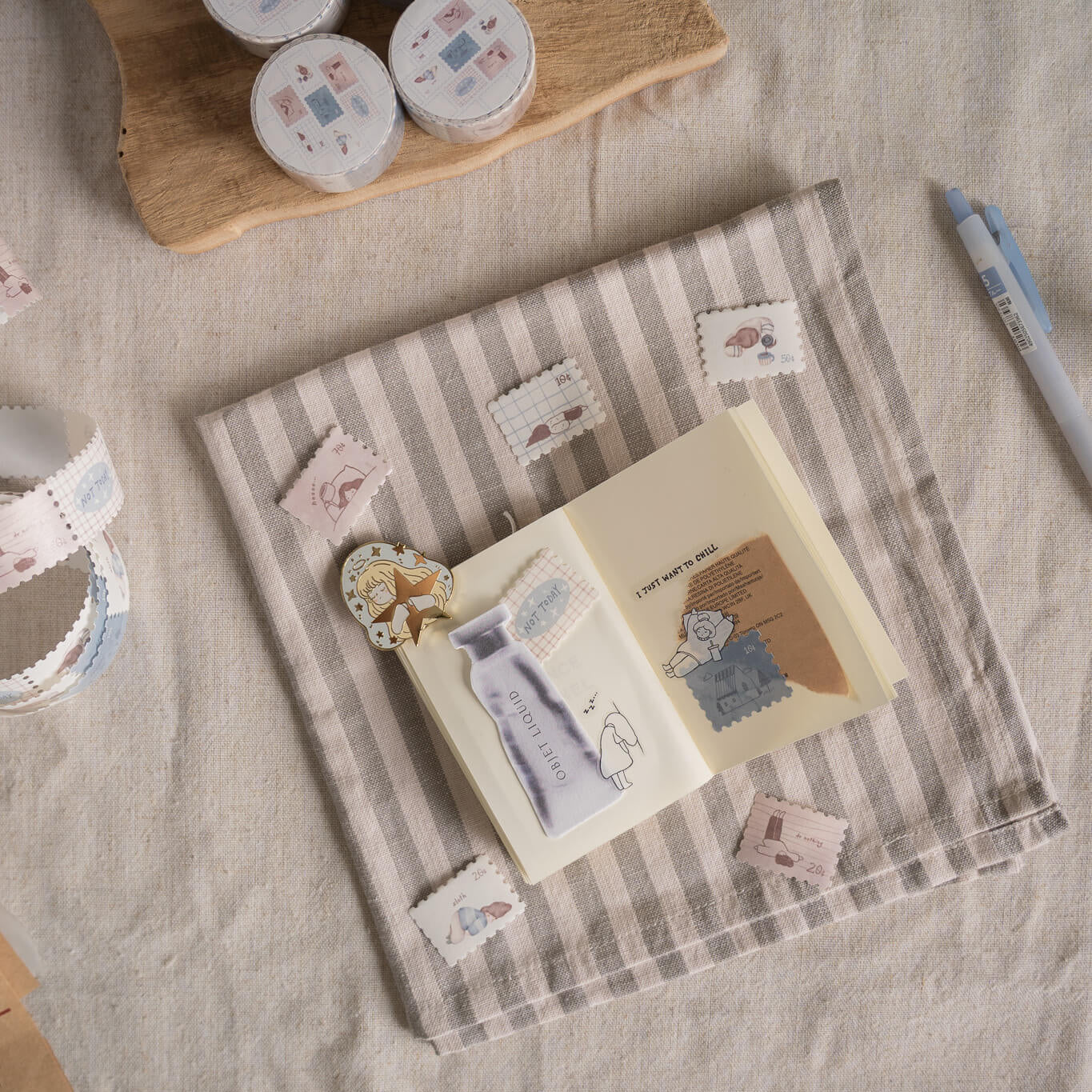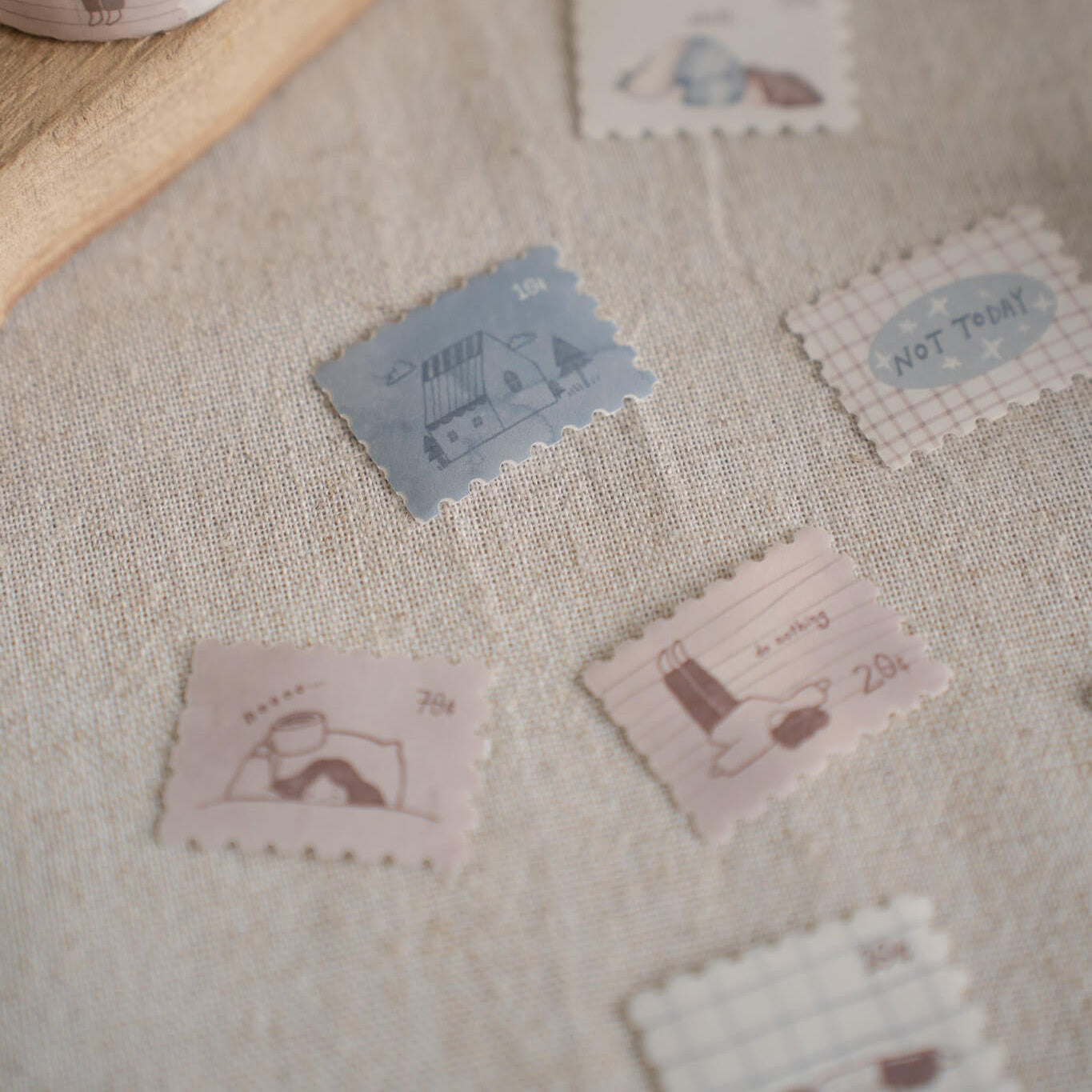 The “Not Today” washi tape by shō Little Happiness reflects the gentle, relatable mood of the series, featuring an adorable illustrated girl in her most unmotivated, resting moments. Each little pose captures that soft resistance to doing anything at all, in the most endearing way.